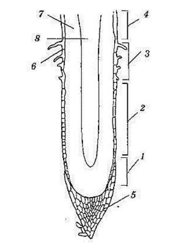 1.зона деления 2.зона роста 3.зона всасывания 4.зона проведения 5.корневой чехлик 6.кожица 7.клетка луба 8.сосуды древесины