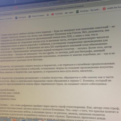Есенину было 19 лет, когда он с поразительной проникновенностью воспел в стихотворении «Русь» грусть материнского ожидания сыновей-солдат. Верность, постоянство чувства, сердечная преданность, неистощимое терпение обобщены и опоэтизированы Есениным в образе матери. «О, моя терпеливая мать!» - это восклицание вырвалось у него не случайно: много волнений приносит сын, но всё прощает материнское сердце.