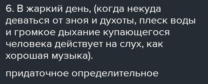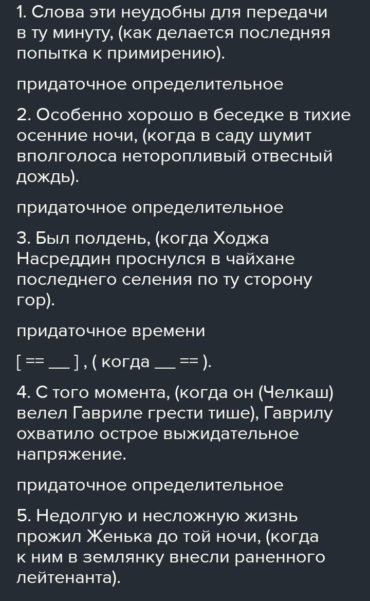 1.Слова эти неудобны для передачи в ту минуту как делается последняя попытка к примирению. (Л.Н.Т.) 2. Особенно хорошо и беседке тихие осенние ночи когда в саду шумит вполголоса неторопливый отвесный дождь. (Пауст.) 3. Был полдень когда Ходжа Насреддин проснулся в чайхане последнего селения по ту сторону гор. (Л. Солов.) 4. С того момента, когда он (Челкаш) велел Гавриле грести тише Гаврилу охватило острое выжидательное напряжение. (М.Г.) 5. Недолгую и несложную жизнь прожил Женька до той ночи когда к ним в землянку внесли раненного лейтенанта. (Тен.) 6. В жаркий день, когда некуда деваться от зноя и духоты плеск воды и громкое дыхание купающегося человека действует на слух, как хорошая музыка (Ч.)