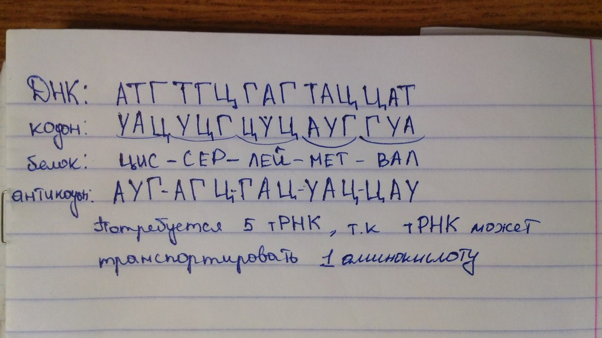 в молекуле ДНК последовательность нуклеотидов -АТГ-ТГЦ-ГАГ-ТАЦ-ЦАТ. Укажите аминокислотный состав белковой цепи, соответствующей этому ДНК. Сколько тРНК понадобится для синтеза белка? Ответ поясните. РЕБЯТ, ОЧЕНЬ ПОМОЩЬ НУЖНА, ПОМОГИТЕ!