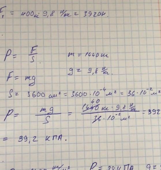 Какое давление на дорогу оказывает автомобиль массой 1440 кг, если площадь соприкосновения колес составляет 3600 см2. Ответ дать в кПа.