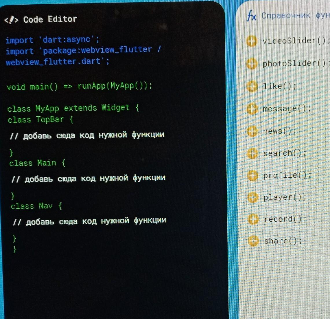 "Нейросеть уже сгенерировала код на основе разработанного дизайна. Осталось дописать код функций. Посмотри в справочнике, как выглядит коф функций, используемых в твоём приложении и допиши их в редакторе кода."