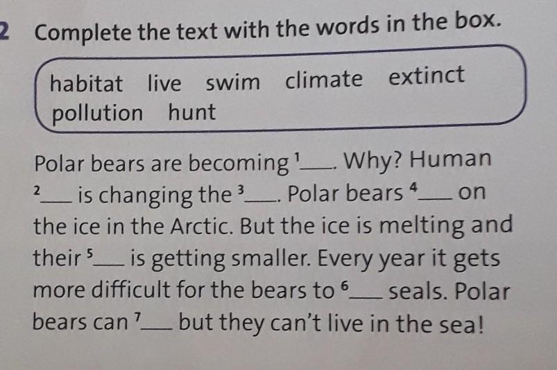 1 swim 2 extinct 3 hunt 4 habitat 5 live 6 climate 7 pollution