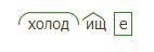 Корень холод. Суффикс ищ. е окончаниe. Холодищ основа