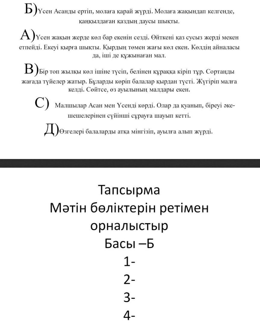 Тапсырма. Мәтін бөлікетерін ретімен ораналастыр. Басы - Б