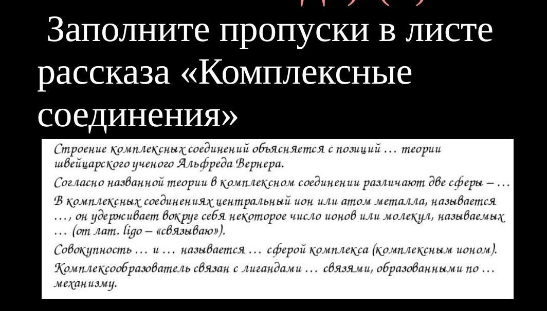 1 координационная теория, 2 внутренняя и внешняя сфера 3 Комплексообразователь