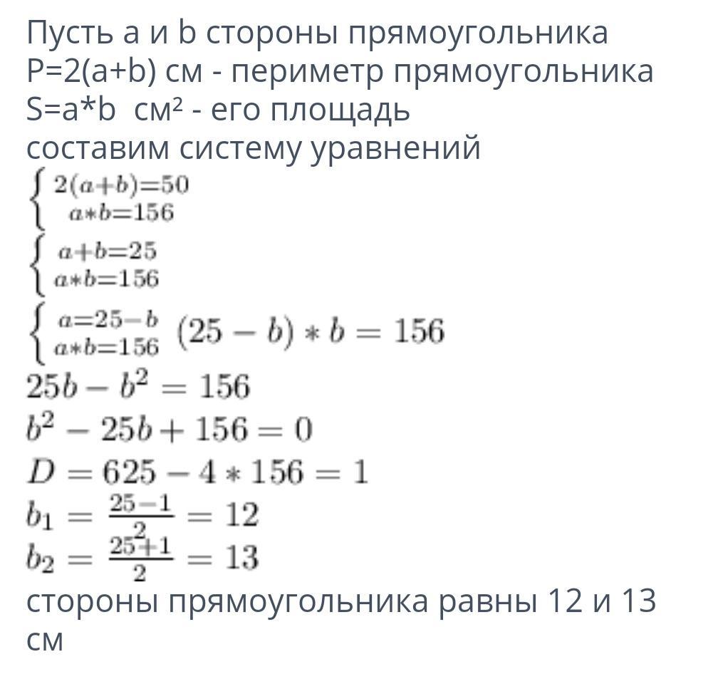 3) Периметр треугольника равен 50 см, а его площадь равна 156 см. Найдите стороны прямоугольника.