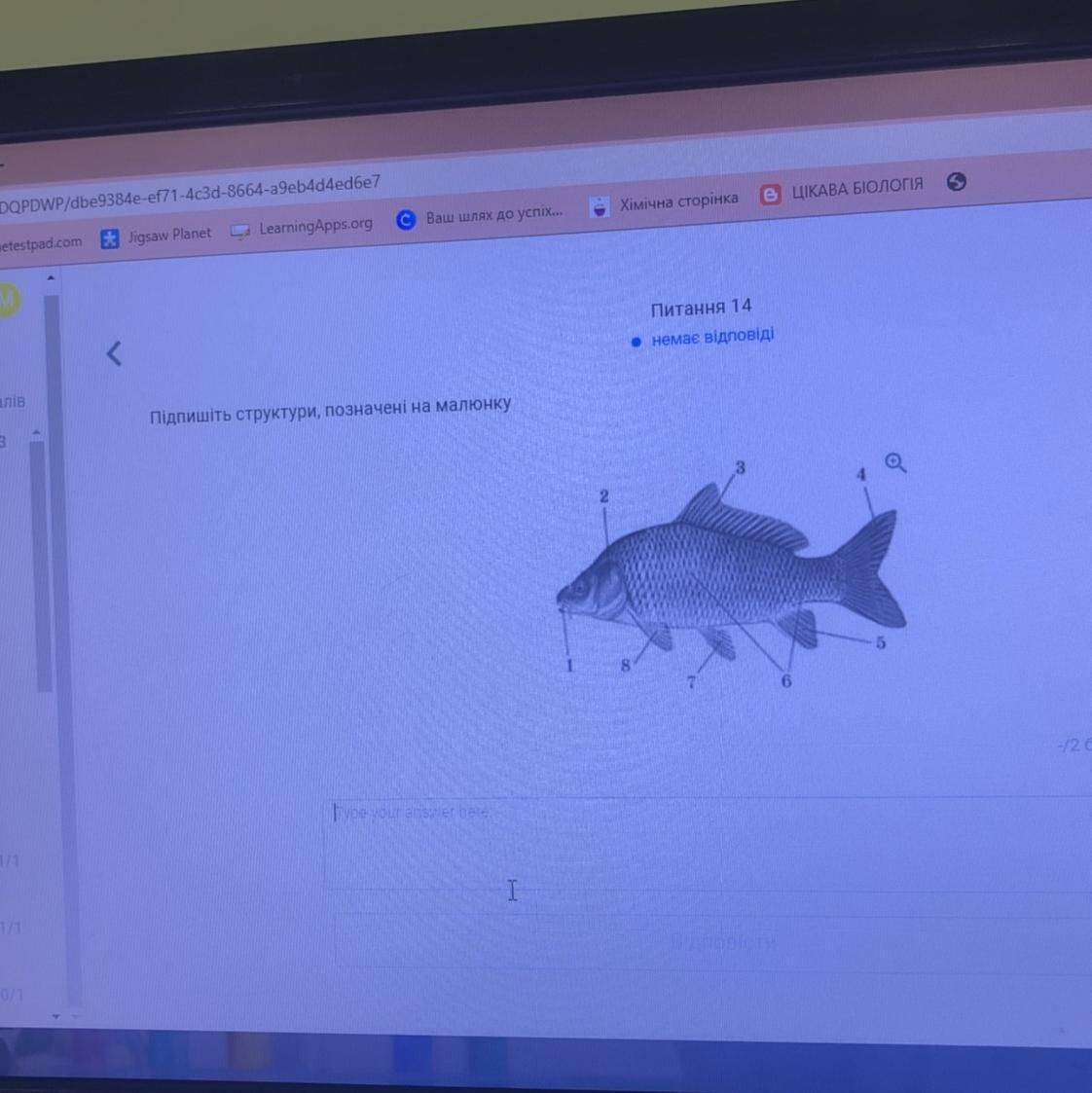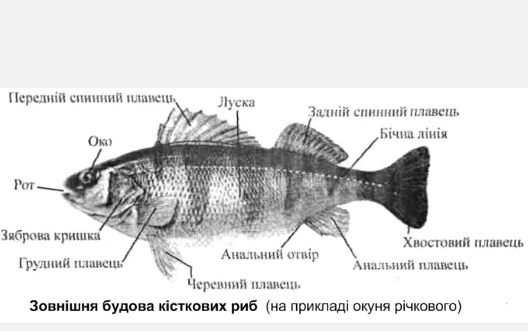 1-рот,2-зяброва кришка, 3-передній спинний плавець, 4-хвостовий плавець, 5-анальний плавець, 6-луска,7-черевний плавець, 8-черевний плавець,