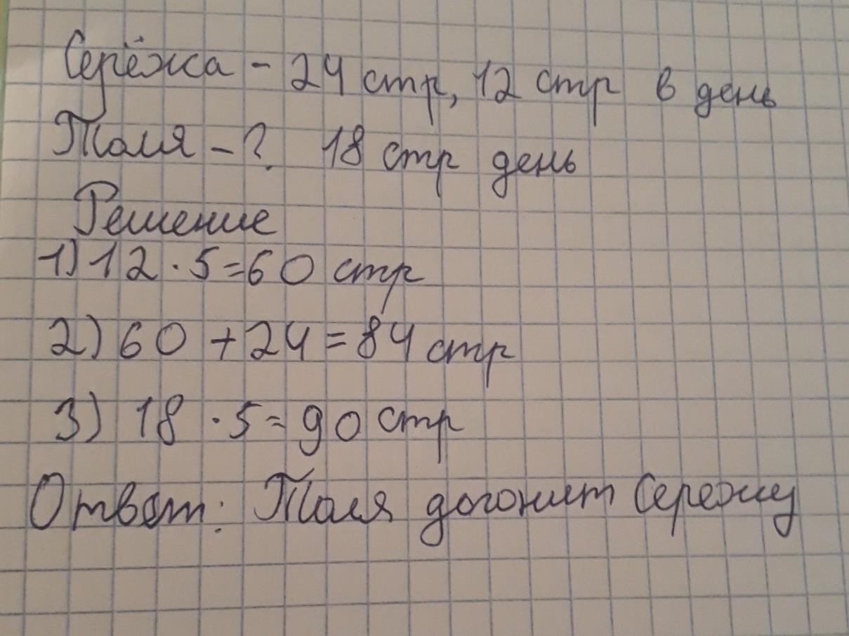 Толя начал читать книгу,когда Сережа прочитал уже 24 страницы такой же книги.Догонит ли Толя Сережу через 5 дней ,если будет читать в день 18 страниц,а Сережа - 12?