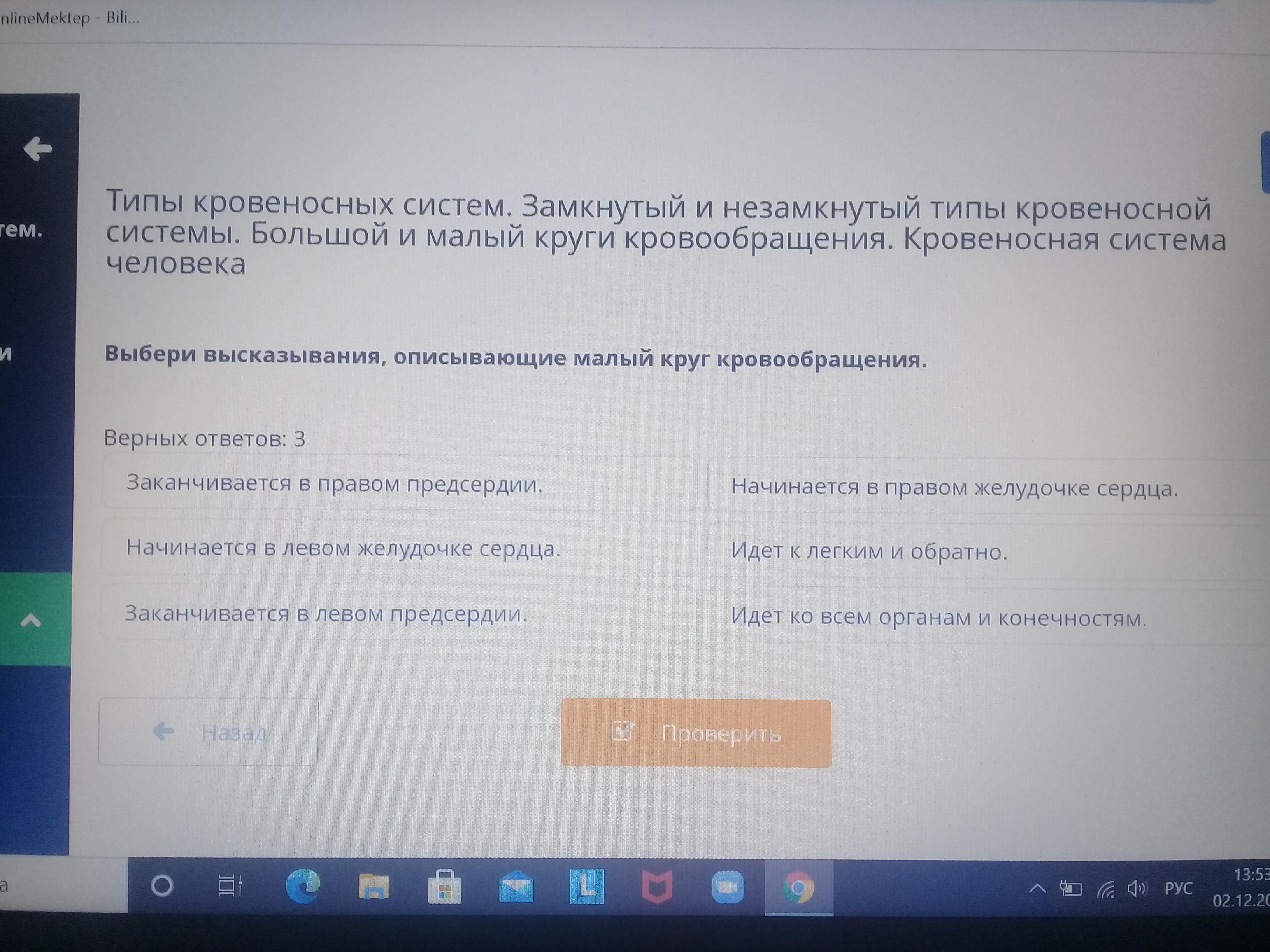Ответ: Начинается в правом желудочке, заканчивается в левом предсердии, идет к легким и обратно