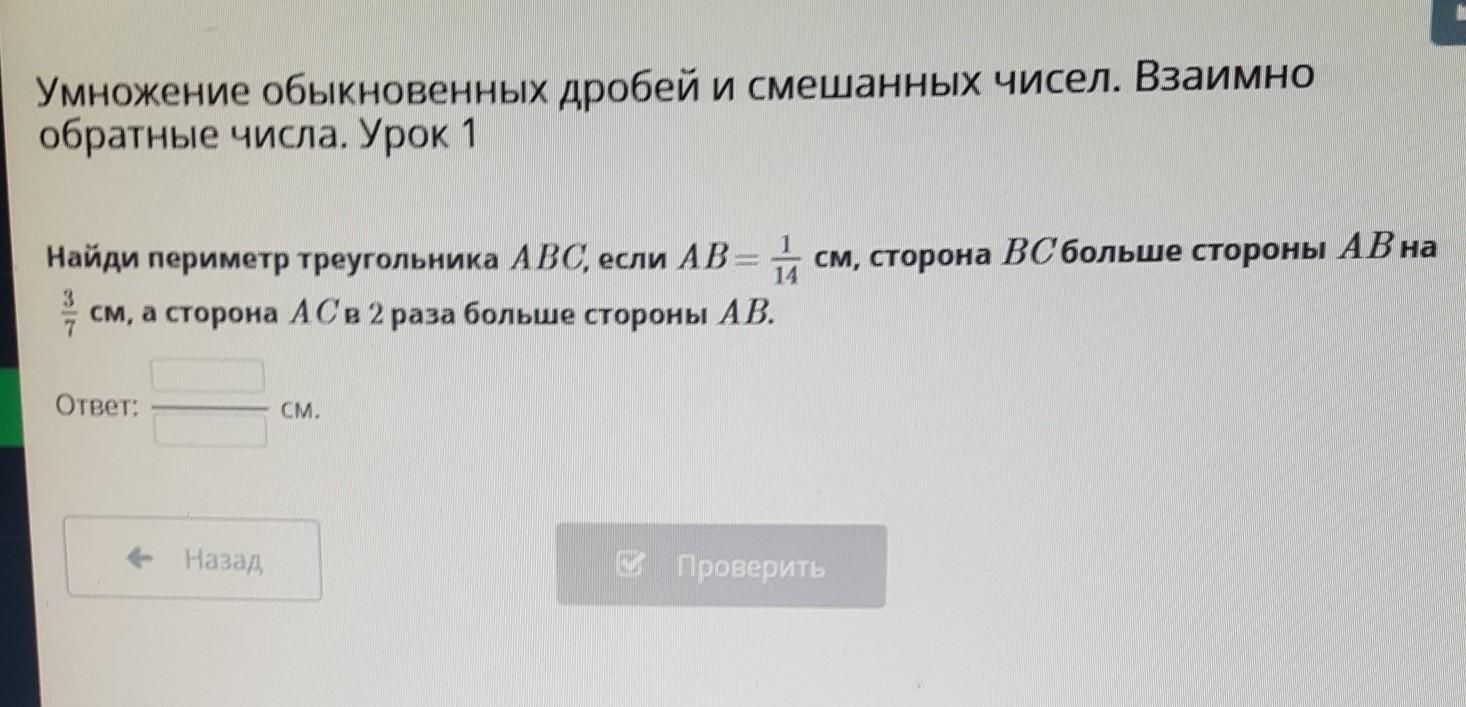 найди периметр треугольника АВС если АВ =1/14 см сторона ВС больше стороны АВ на 3/7 см а сторона АС в 2 раза больше стороны АВ