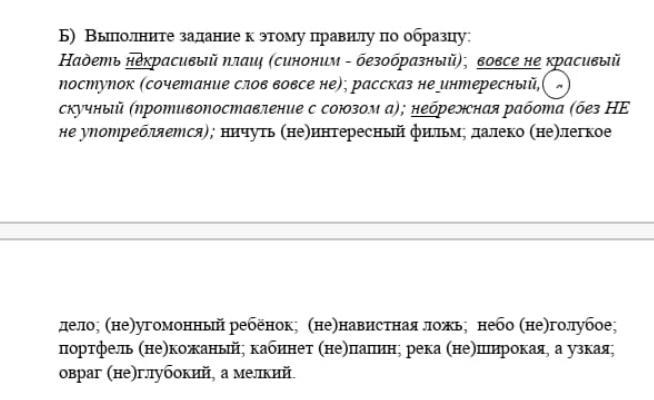Ничуть не интересный фильм; далеко не лёгкое; неугомонный ребёнок; ненавистная ложь; небо не голубое; портфель не кожаный; кабинет не папин; река неширокая, а узкая; овраг не глубокий а мелкий.