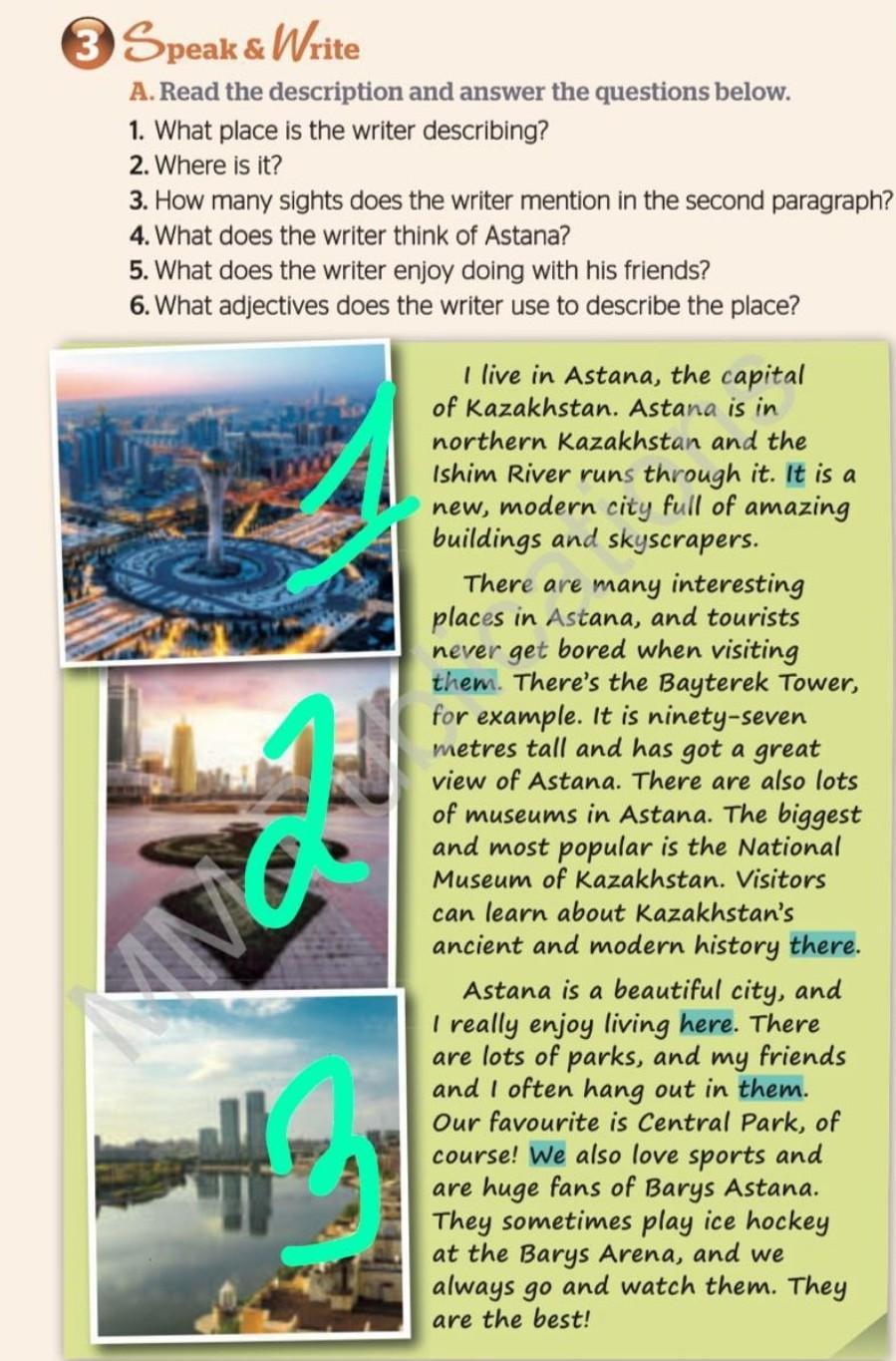Read the description and answer the questions below. 1. What place is the writer describing? 2. Where is it? 3. How many sights does the writer mention in the second paragraph? 4. What does the writer think of Astana? 5. What does the writer enjoy doing with his friends? 6. What adjectives does the writer use to describe the place? Pls
