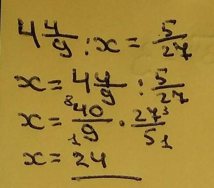 x=40/9÷5/27=40/9×27/5=(40×27)/(9×5)=(8×3)/(1×1)=24/1=24