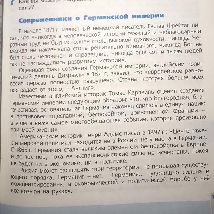 Ответ: я постараюсь ответить. Мне кажется, что практически все современники считают что вся политика в общем это тяжкий труд, и что очень часто справедливость не торжествует. Так же они говорят что Германия стала великим элементом беспокойства в Европе, и что в экономической и политической борьбе у нее все козыри на руках. То есть в Германии огромные беспокойства насчет ранее перечисленого и т.д.