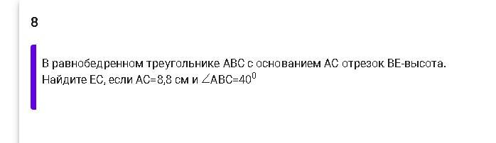 5. Т.к. ВЕ высота, а треугольник равнобедренный, то ЕС = 1/2АС = 4.4