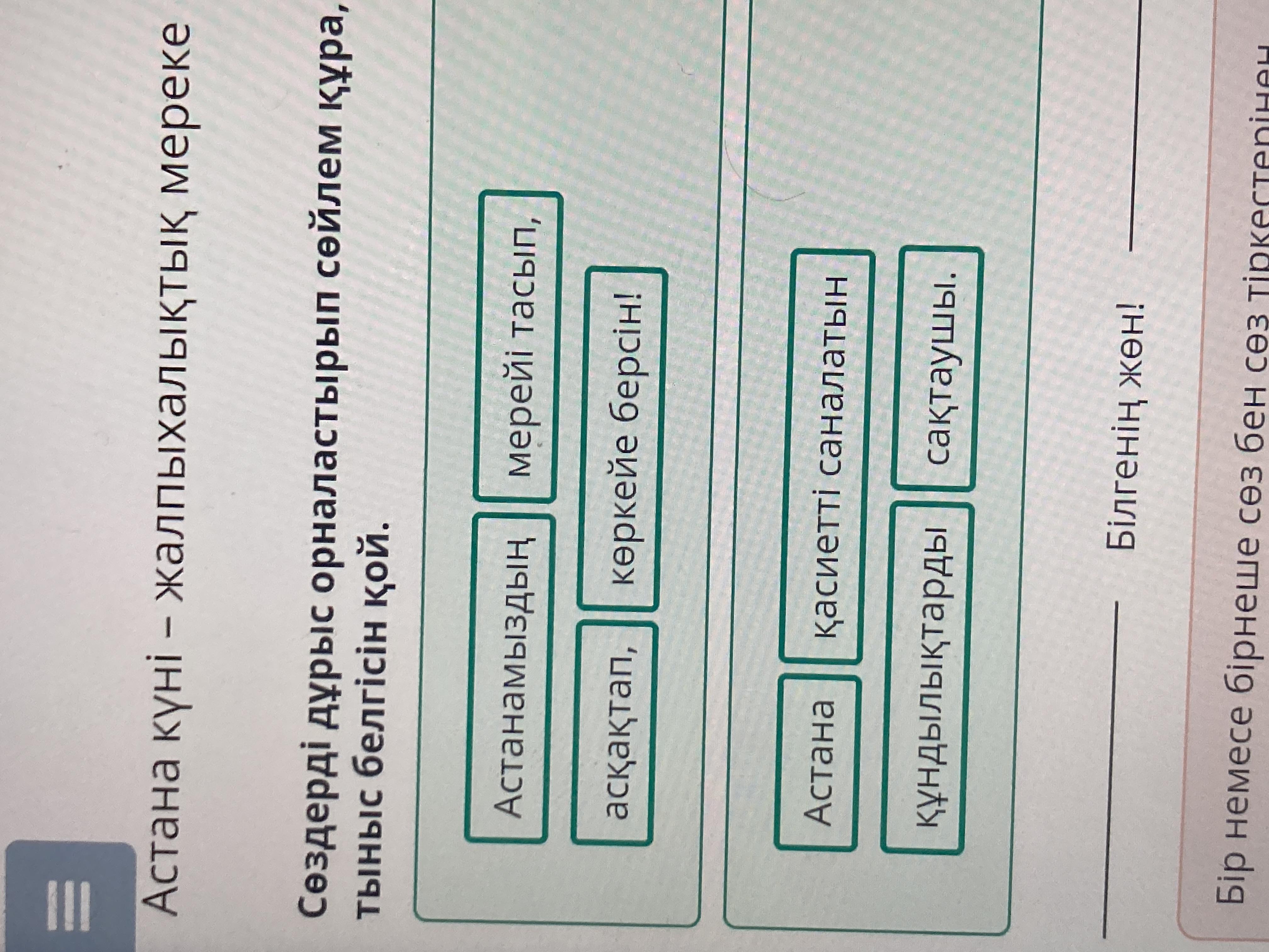 Сөздерді дұрыс орналастырып сөйлем құра, тыныс белгісін қой.