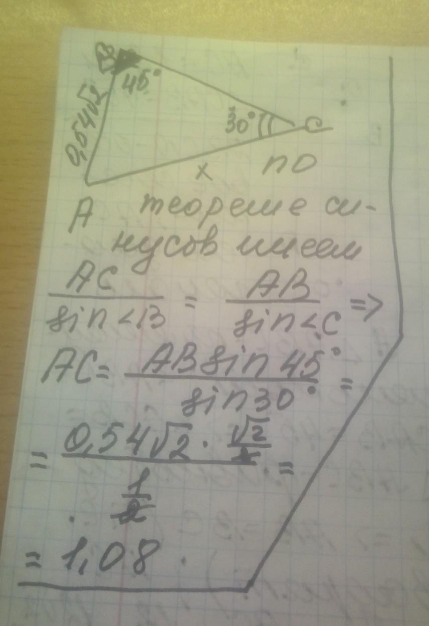 В треугольнике ABC дано: AB=0.54 * √2, ∠B=45 градусов, ∠С=30 градусов