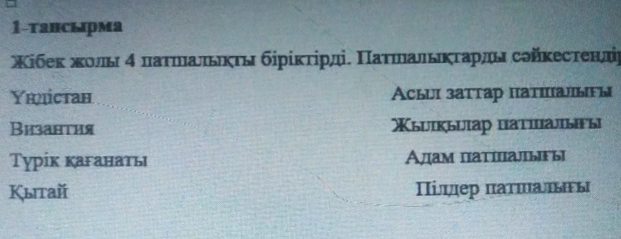 Помогите пжжжжж Жібек жолы 4 патшалықты біріктірді. Патшалықтарды сәйкестендір. Үндістан Византия Түрік қағанаты Қытай Асыл заттар патшалығы Жылқылар патшалығы Адам патшалыгы Пілдер патшалығы