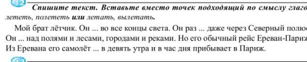 Мой брат летчик.Он летал во се концы света.Он раз даже через Северный полюс. Он летал над полями и лесами,городами и реками. Но его обычный рейс Ериван-Париж.Из Еревана его самолет вылетает в десять утра и в час дня прибывает в Париж.