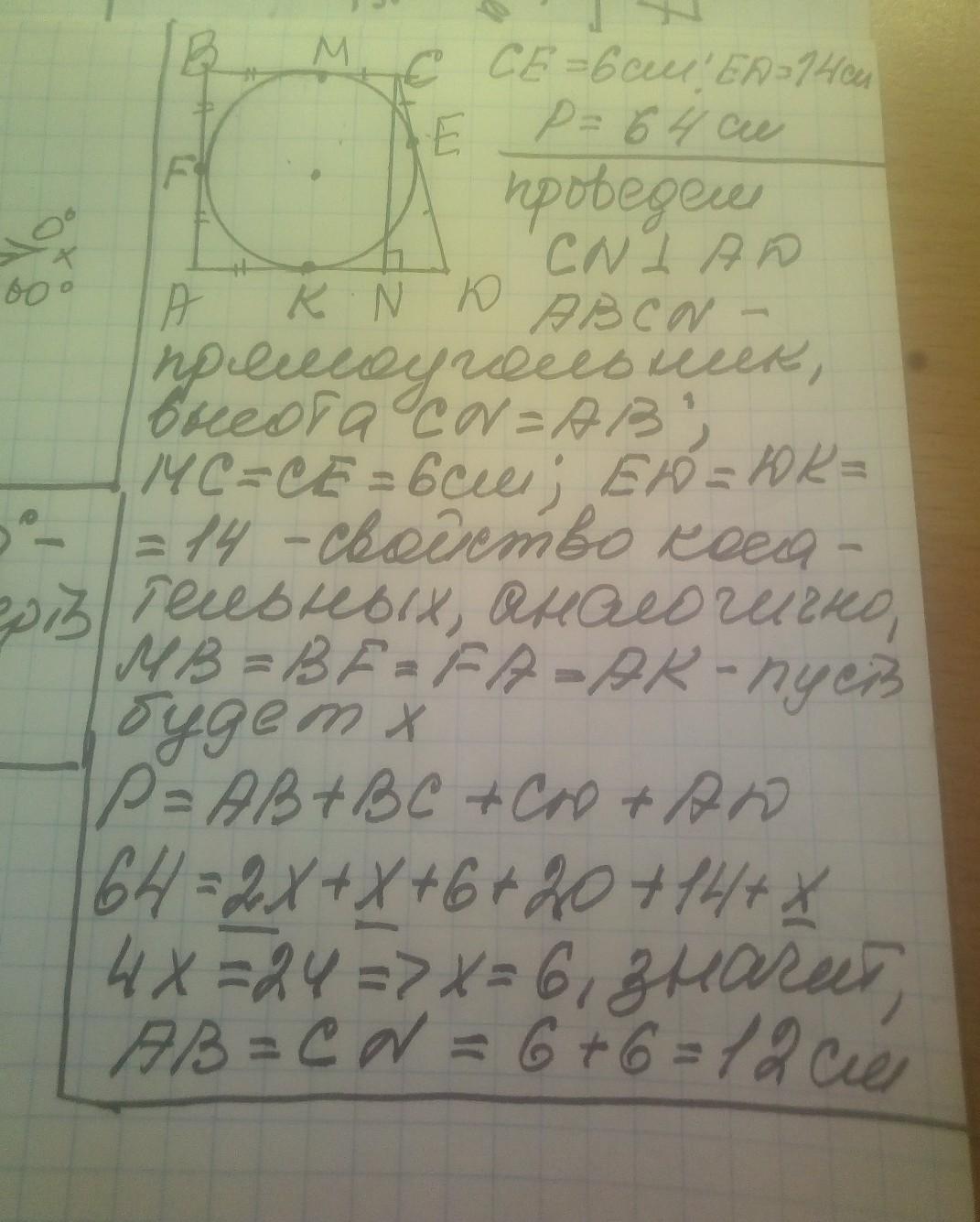 Окружность,вписанная в прямоугольную трапецию делит большую боковую сторону на отрезки длинной 6 см и 14 см.Найдите высоту трапеции,если её периметр равен 64 см.ПОМОГИТЕ СРОЧНО 45 БАЛЛОВ