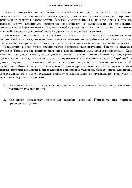 1) ПРЕДПОСЫЛКИ СПОСОБНОСТЕЙ. Ребёнок рождается с задатками, которые выступают в качестве природных предпосылок развития способностей. 2) РАЗВИТИЕ ЗАДАТКОВ В СПОСОБНОСТЬ. Развитие задатков в способности зависит от исторических условий, потребностей общества. Некоторые способности развиваются, когда в них появляется общественная необходимость.3) ЗАВИСИМОСТЬ ТАЛАНТА ОТ СОЦИАЛЬНЫХ УСЛОВИЙ. Если у человека есть выдающиеся задатки, то он достигает токого уровня развития своего таланта, который возможен в определенных социальных условиях. ПРИРОДНЫЕ ЗАДАТКИ ЧЕЛОВЕКА - особенности строения мозга и органоа чувств, которые выступают в качестве природных предпосылок развития способностей. ПРИРОДНЫЕ ЗАДАТКИ: 1) Острая наблюдательность 2) Хорошая зрительная память