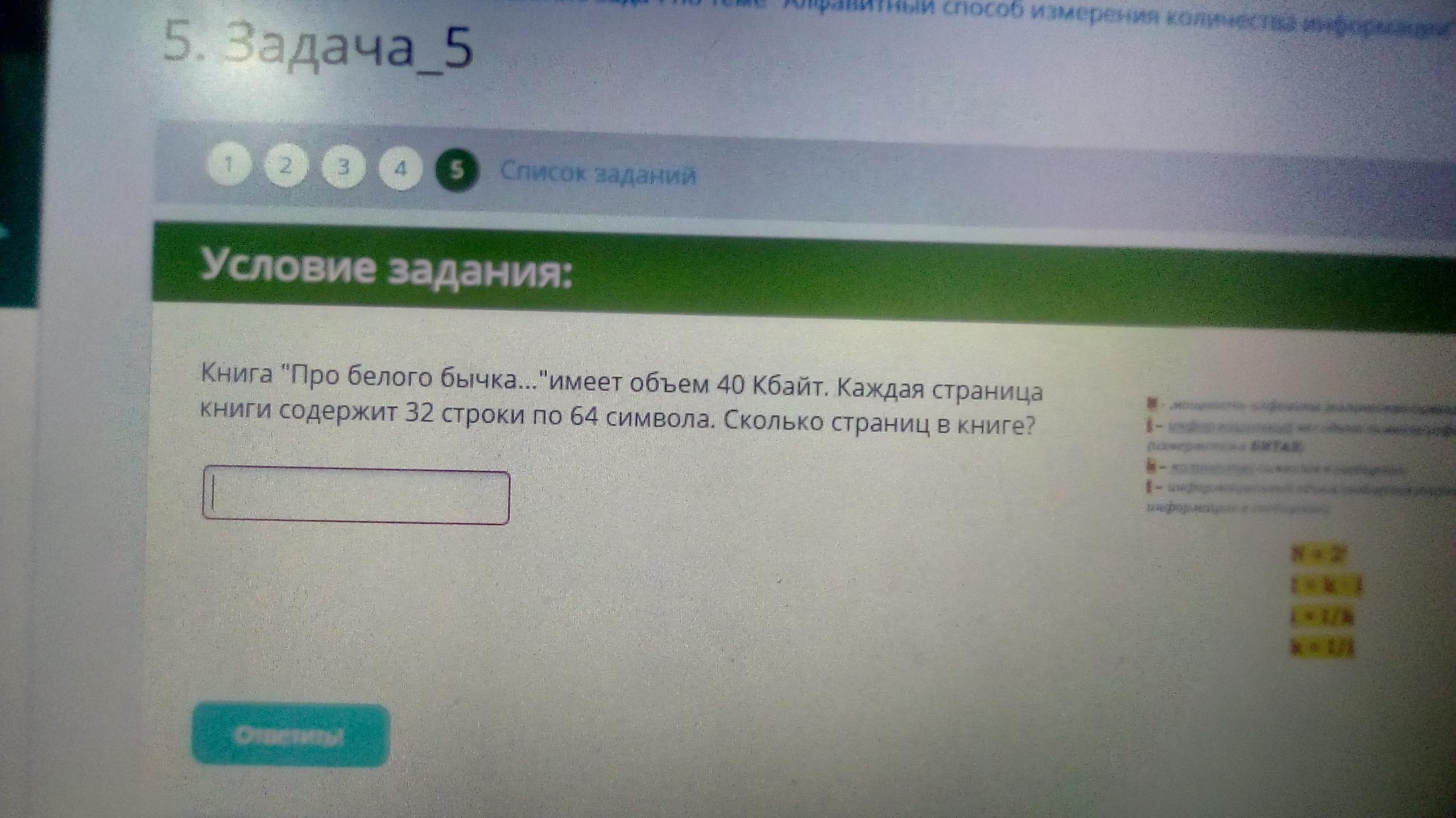 Книга "Про белого бычка..." имеет объем 40 Кбайт. Каждая страница книги содержит 32 строки по 64 символа. Сколько страниц в книге?
