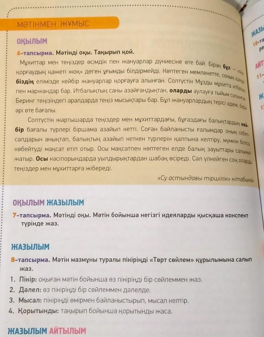 Жан-жануарларды қорғауға алуды күшейту керек деп санаймын. Себебі, көптеген жануарлардың түрлері жойылу алдында тұр. Мысалы, мәтінде айтылғандай, қазіргі таңда теңіздерде, мұхиттарда, бұғаздарда бағалы балықтардың түрлері азайып кеткен. Қорытындылай келе, жан-жануарларға аса мейірімділікпен қарап, оларды қорғауға алып, бағалы жануарларымызды сақтай білуіміз керек.