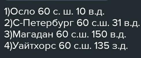 найдите города расположенные на 60 градусов с.ш. для каждого города определи географическую долготу и запишите его координаты ПЛИЗ СРОЧНО ДАЮ 50