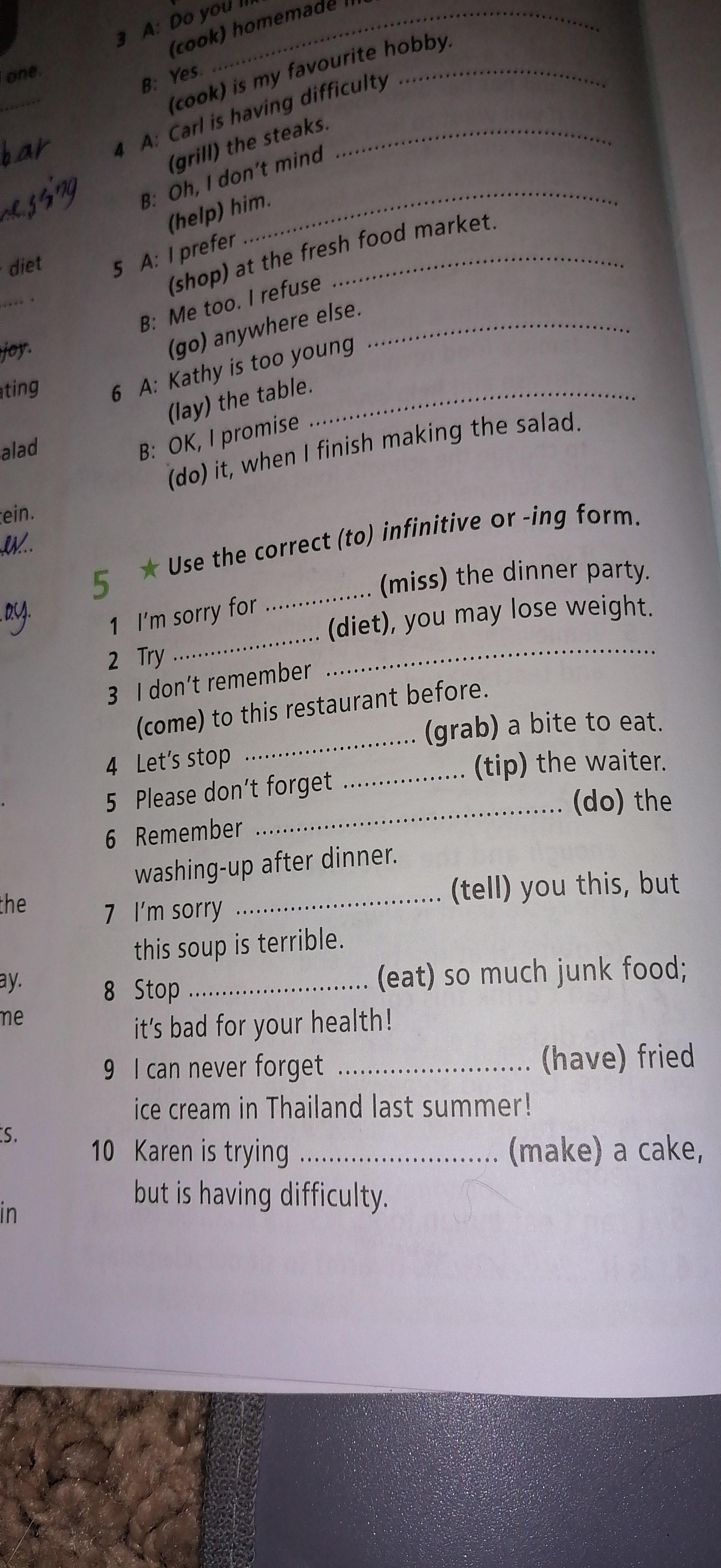 1 missing 2dieting 3coming 4to grab 5to tip 6to do 7to tell 8eating 9having 10 to make