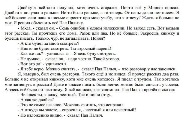 Я очень старался, но все равно получил двойку. Я у Мишки почти всю работу списал. Хотя я двойки и раньше получал. Но сейчас же я другой, что было раньше меня не волнует. Папа давно не пишет.я очень боялся что в письме папа спросит про мои оценки, я не знал что и ответить. Я больше не мог ждать и все рассказать Пал Палычу