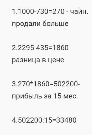 За 15 месяцев в магазине продажа чайников увеличилась с 730 до 1000 штук, а цена за чайник возросла с 435 рублей до 2295 рублей. На сколько в среднем повысился ежемесячный доход магазина от продажи чайников? Ответ должен быть 131830