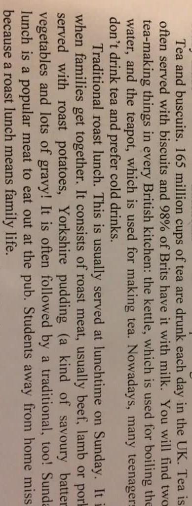 Чай и бисквиты. Ежедневно в Великобритании выпивают 165 миллионов чашек чая. Чай часто подают с печеньем, а 98% британцев - с молоком. На каждой британской кухне вы найдете два приспособления для приготовления чая: чайник, который используется для кипячения воды, и чайник, который используется для заваривания чая. Сегодня многие подростки не пьют чай и предпочитают прохладительные напитки. Традиционный жареный обед. Обычно это подается в обеденное время в воскресенье. Это когда собираются семьи. k состоит из жареного мяса, обычно из говядины, баранины или порли, подается с жареным картофелем, йоркширского пудинга (разновидность пикантных овощей и большого количества подливки! За ним также часто следует традиционный завтрак! Студенты вдали от дома скучают, потому что жареный ланч - это семейная жизнь.