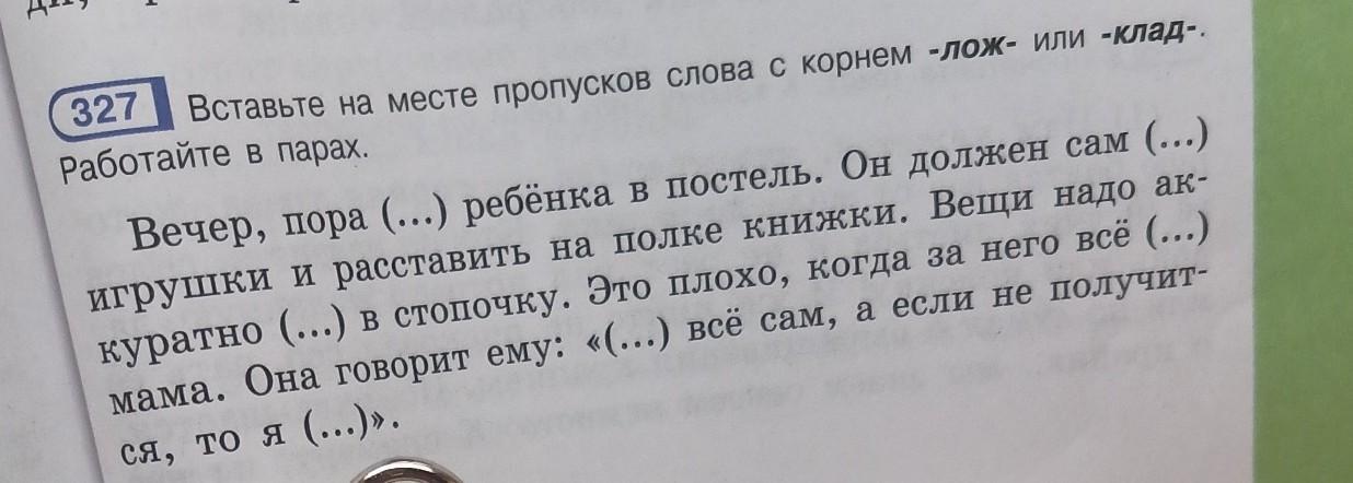 Вечер, пора класть ребёнка в постель. Он должен сам сложить игрушки и расставить на полке книжки. Вещи надо аккуратно сложить в стопочку. Это плохо, когда за него всё складывает мама. Она говорит ему: «Складывай всё сам, а если не получится, то я сложу».