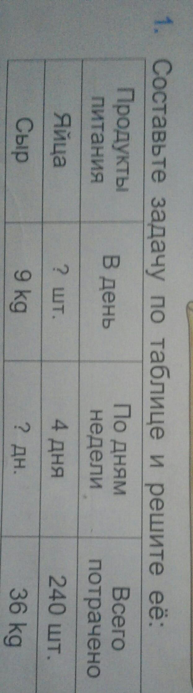 Составте задачу по таблице и решите её:Продукты питание Яйца Сыр В день яйца ?шт Сыр 9 кг По дням недели Яйца 4 дня Сыр ?дн. Всего потрачено Яйца 240 шт Сыр 36 кг пожалуйста помогите пожалуйста умоляю помогите решение помогите срочно
