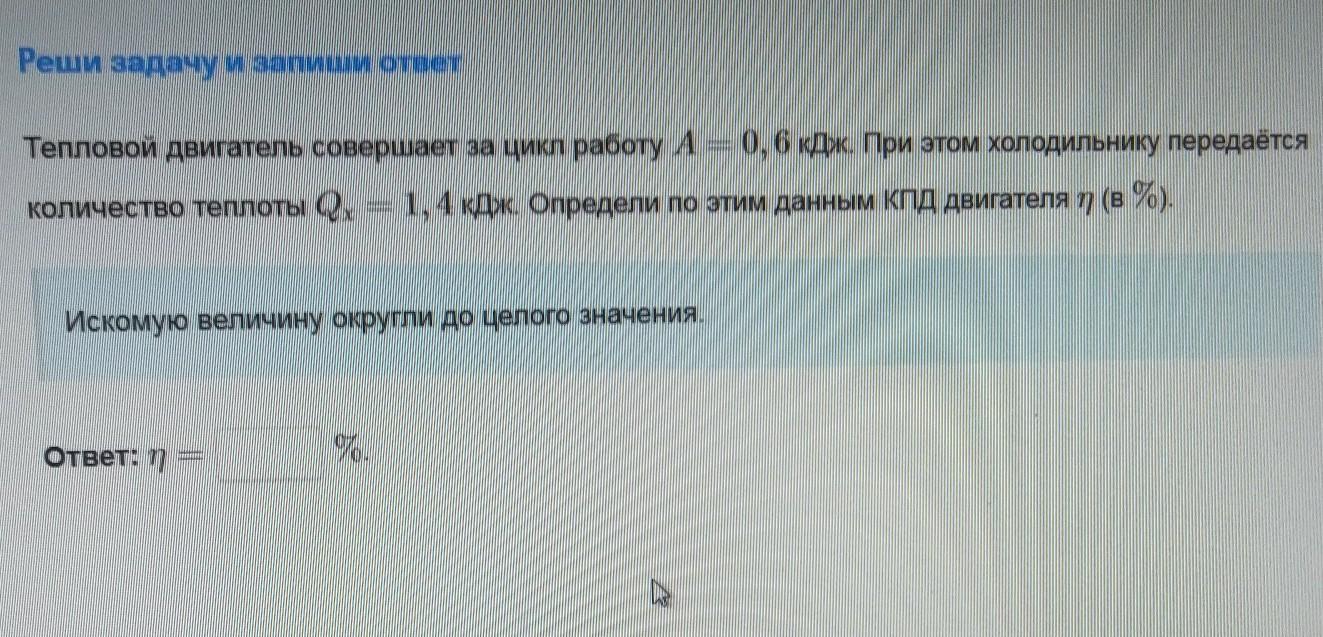КПД = А·100% / Q₁ = 0,6·100 / 2 = 30%