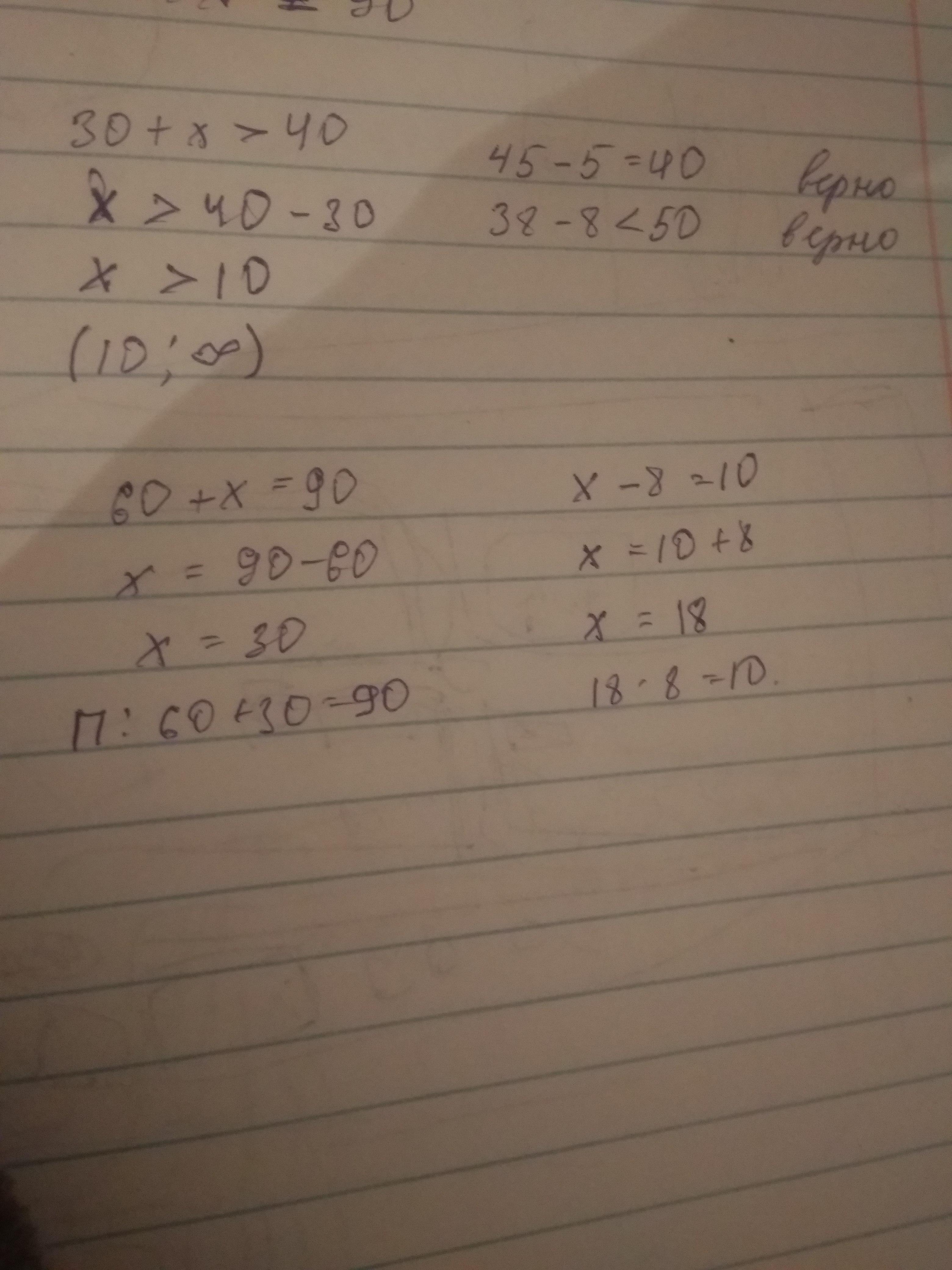Как решит эти уровнение 2 класса найди среди следующих записей уровнения выпиши их и реши 30+х>40 80-х 45-5=40 38-8<50. 60+х=90 х-8=10