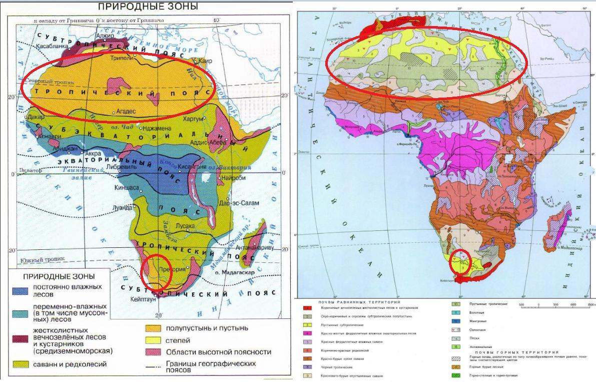В пустынях Африки в основном преобладают пустынные тропические почвы, пустынные субтропические, пески, по побережью можно встретить красно-бурые почвы опустыненных саванн и серо-коричные почвы.