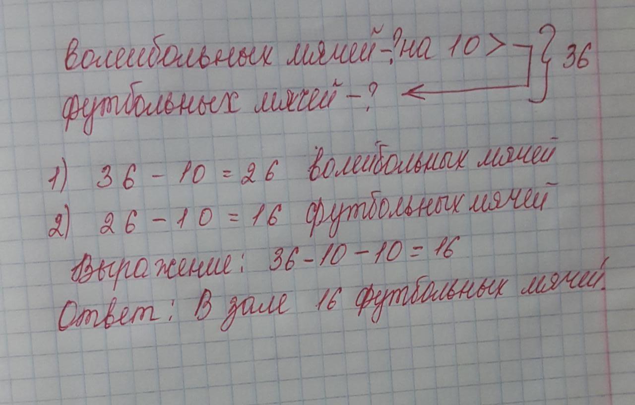 В спортивном зале 36 мячей. Волейбольных мячей на 10