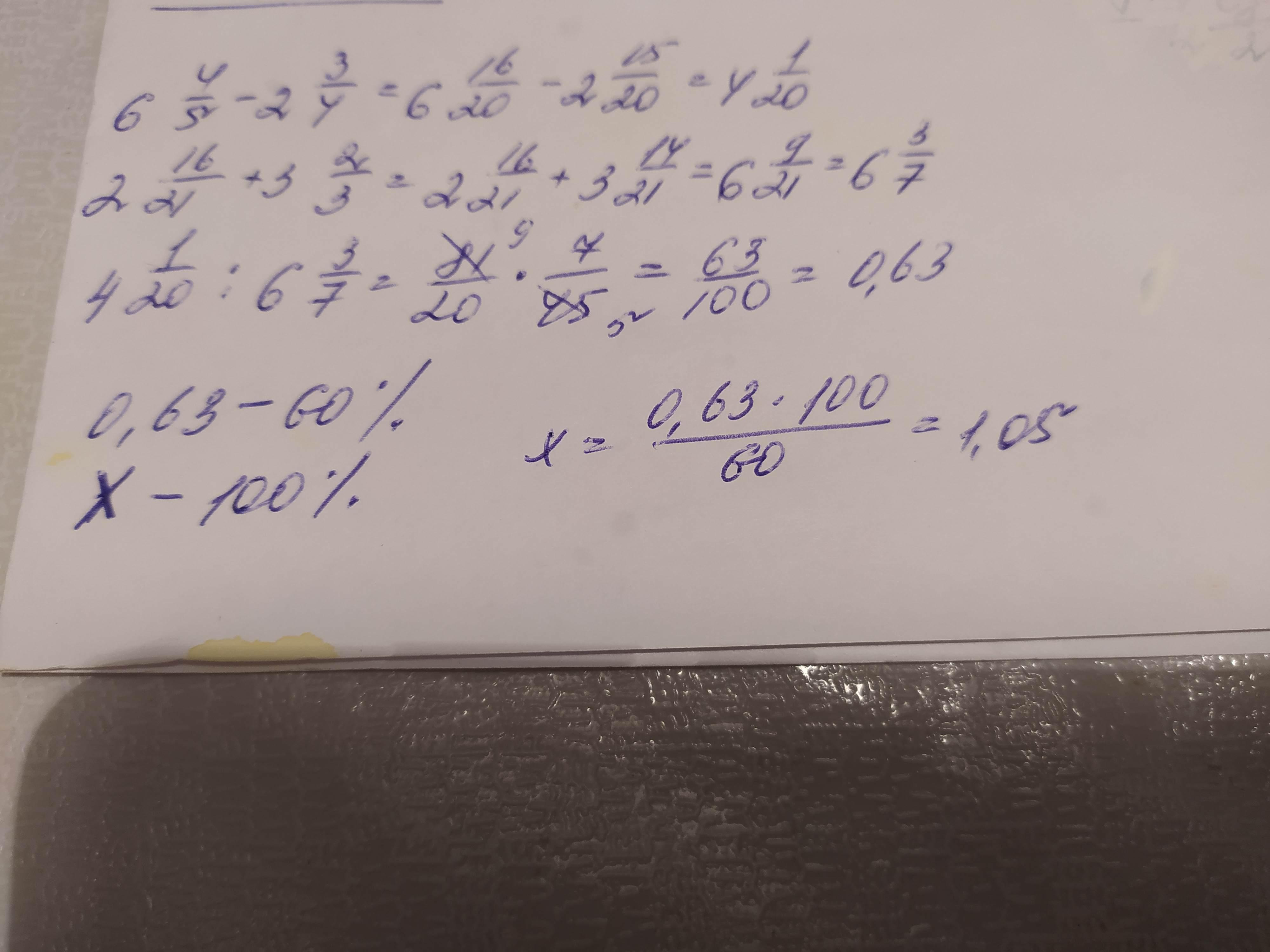 знайдіть число 60 якого дорівнюють значенню виразу (6 4/5 -2 3/4):(2 16/21 +3 2/3) =