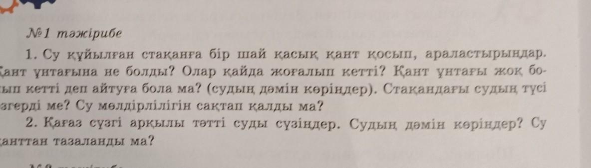 судағы қант еріп кетті. судың дәмі тәтті болды. су мөлдірлігін жоғалтты. судағы қантты сүзіп алу мүмкін емес.
