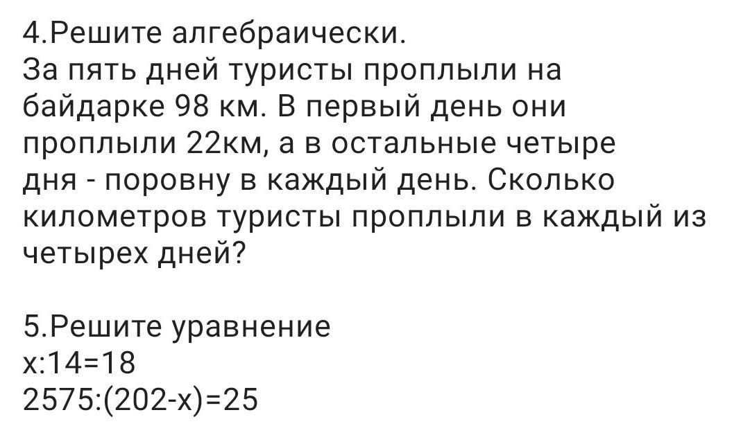 решите алгебраический за 5 дней туристы проплыли на байдарке его 98 км В первый день они проплыли 22 км а в остальные четыре дня поровну каждый день сколько километров туристы проплыли каждый из них 4 дней. КРАТКАЯ ЗАПИСЬ ПОЖАЛУЙСТА