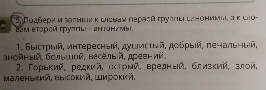 номер 5 подбери и запиши к словам первой группы синонимы, а к словам второй группы-антонимы.