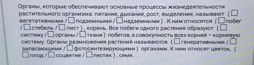 прочитайте текст "Основные органы растений" и вставьте пропущенные слова в пропуск в тексте