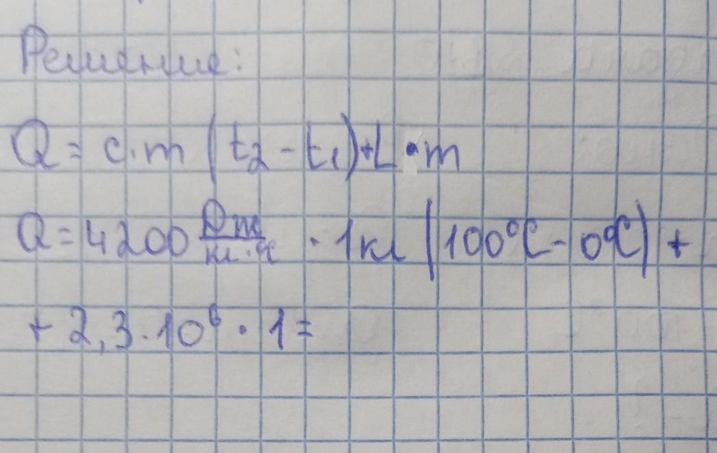 Q=4200*1*(100-0)+2.3*10^6*1=420000+2300000=2720000 Дж=2,72 МДж