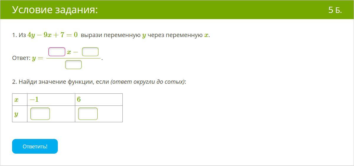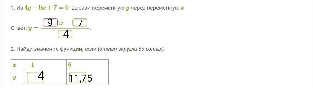 х=-1;. у=(9х-7)/4=(9(-1)-7)/4=-16/4=-4 первое значение у=-4 при х=-1