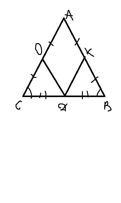 О и К середины боковых сторон равнобедренного треугольника АВС, значит АО=ОС=АК=ВК.