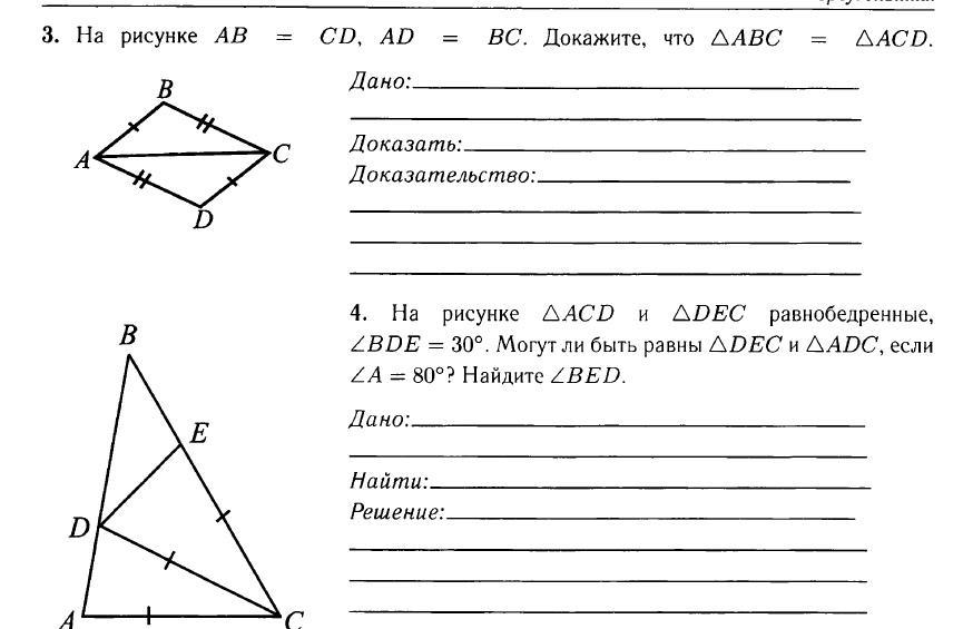 3) ABC=ABD, потому что по условию у этих треугольков равны 2 стороны, а также есть общая сторона, поэтому эти треугольники равны по 3 признаку