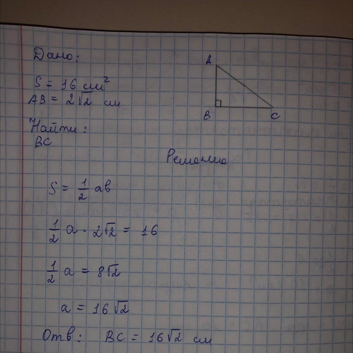 2 Площадь прямоугольного треугольника равна 16 см2, а один из катетов равен 2√2 см. Найдите другой катет.