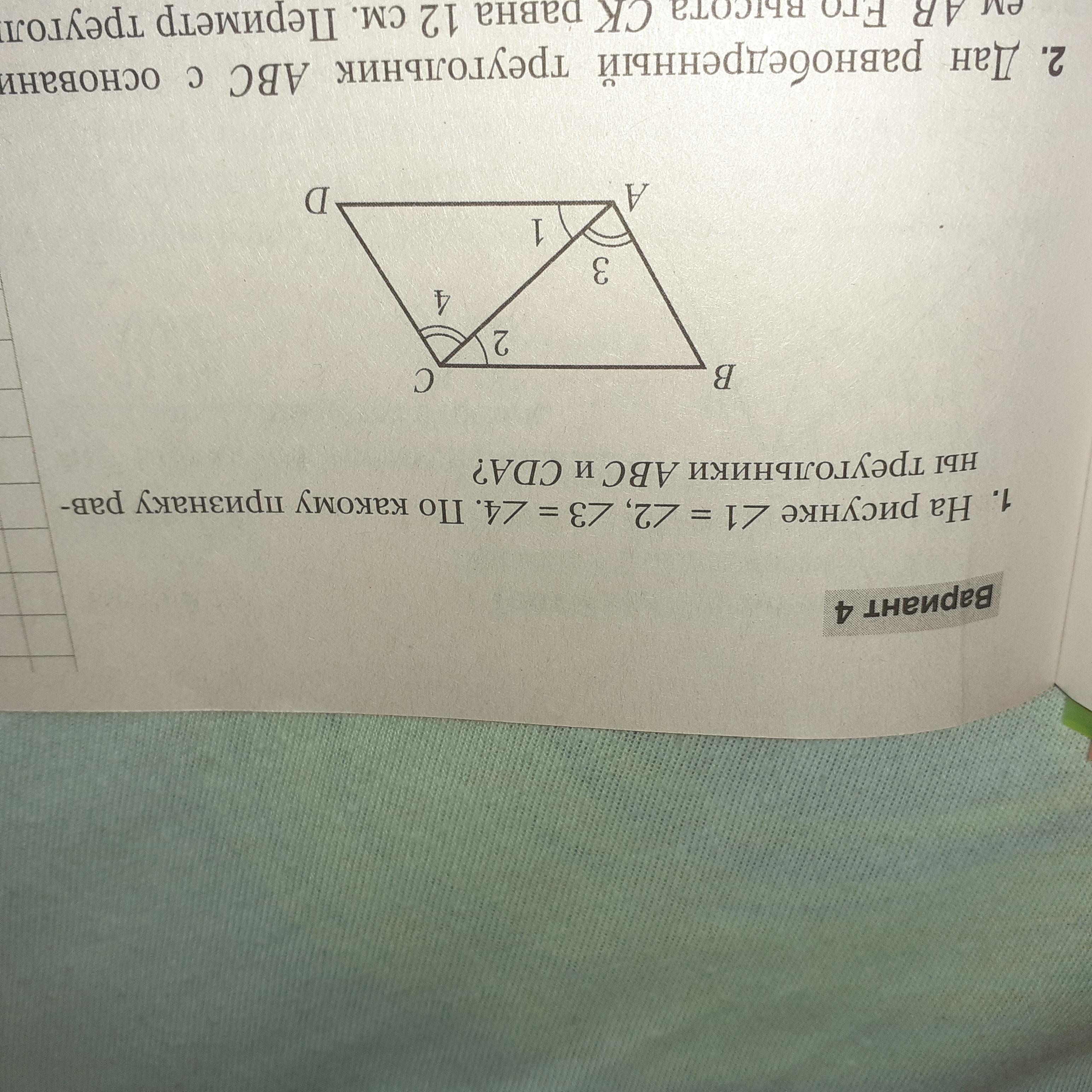 Помогите пожалуйста!!! На рисунке угол 1 равен углу 2 угол 3 равен углу 4 По какому признаку равны треугольники ABC и CDА